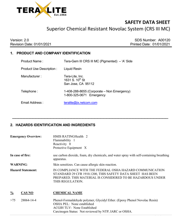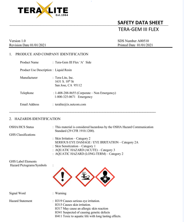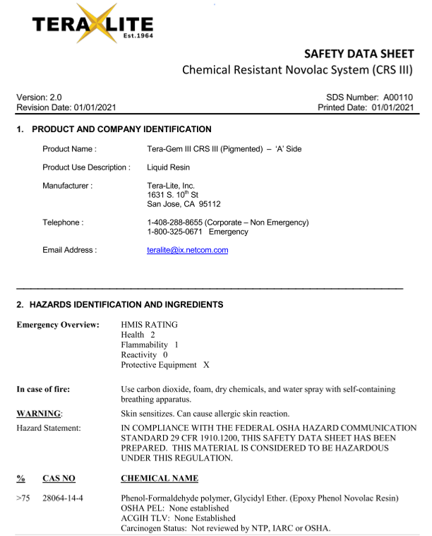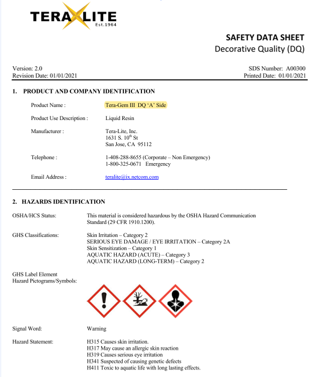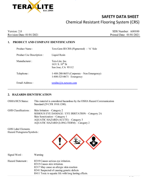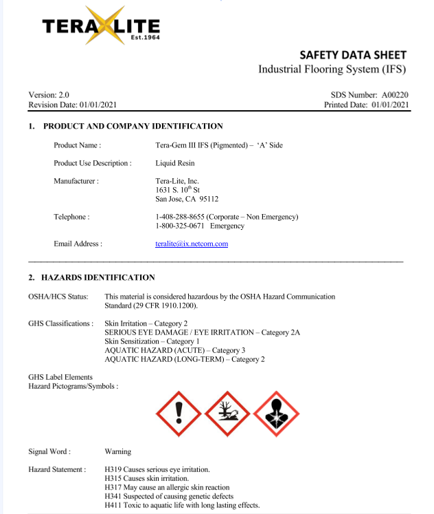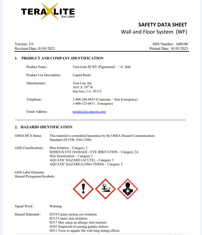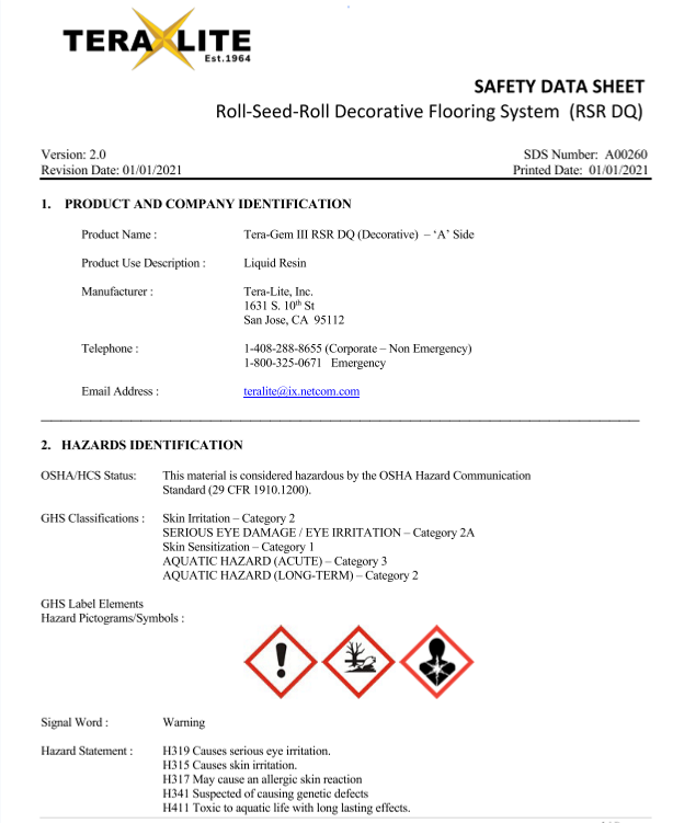 Our Safety Data Sheets (SDS) provide critical information on the safe handling, usage, storage, and disposal of Tera-Lite products, including Tera-Gem III. Each SDS contains comprehensive details on the physical and chemical properties, potential health and environmental hazards, and first-aid measures for our resinous flooring solutions. We prioritize safety at every stage, ensuring that our clients have the information needed to manage our products responsibly in diverse industrial and commercial environments.
